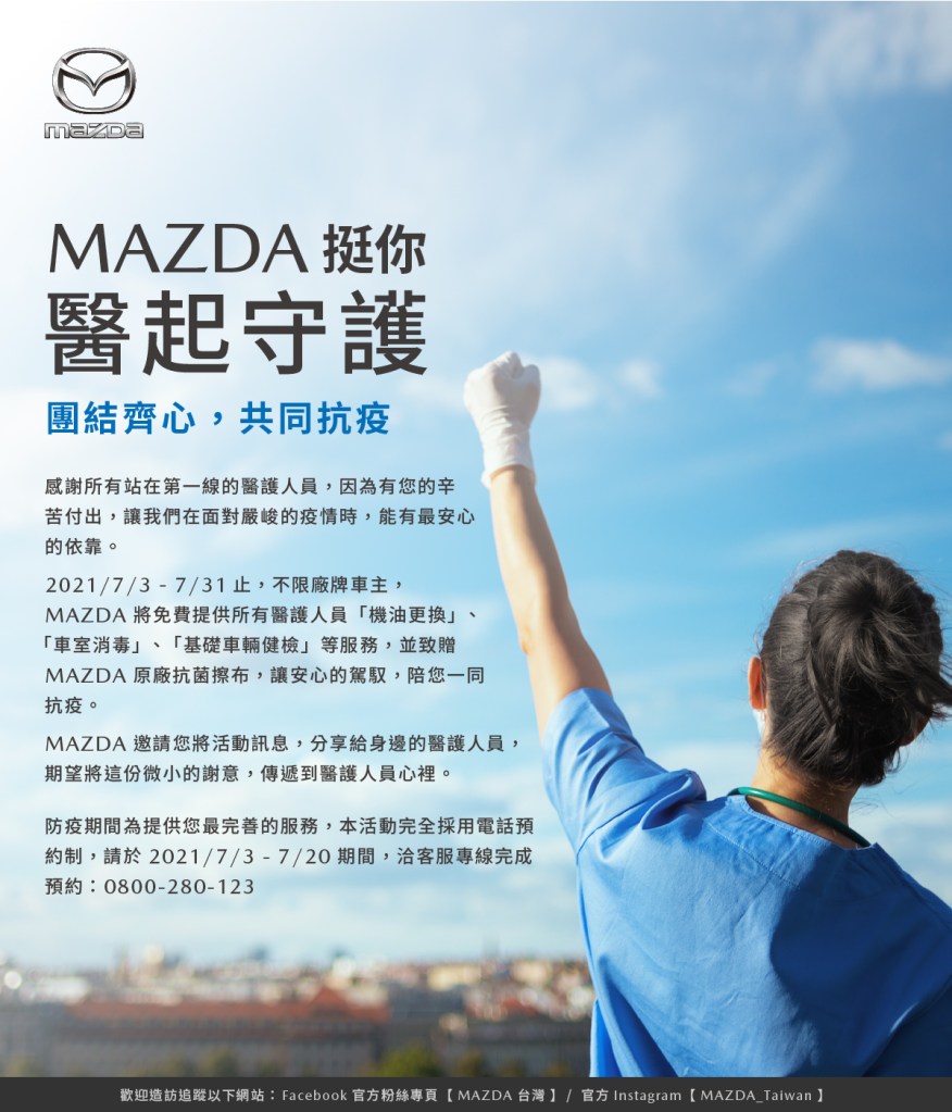 前線有醫護人員守護全民健康,MAZDA則期望能做醫護人員的堅強後盾。維繫良好的車況才能確保安心的移動,讓醫護人員投入防疫更加無後顧之憂。為提供最安心完善的服務,不分廠牌的醫護人員車主,只要撥打MAZDA客服專線0800-280-123進行事前預約*,返廠即可享有免費車輛保養與基礎健檢,包含免費更換機油及MAZDA標準流程車室消毒之服務,並贈予車室專用的MAZDA原廠抗菌擦布。台灣馬自達亦將於7月6日於Facebook官方粉絲專頁【MAZDA台灣】( https://www.facebook.com/MazdaTaiwan/ )進行募集照片留言挺醫護的網路活動,邀請更多人以具體行動一同響應為醫護人員加油打氣,並表達最深的支持與感謝。面對疫情的嚴峻考驗與挑戰,MAZDA相信唯有不分彼此、齊心抗疫,才能攜手重返安心的生活日常。透過「MAZDA挺你,醫起守護」活動,希望將這份感謝之心,傳遞給全台醫護人員,共同為醫護人員致上最高敬意。我們將會一起走過這段艱難的路程,共同迎來重新探索世界的美好!欲得知「MAZDA挺你,醫起守護」活動詳情與相關條款細節,歡迎造訪 MAZDA 官方網站 -「MAZDA挺你,醫起守護」活動專屬頁面( https://www.mazda.com.tw/news/CSR-202107/ )。