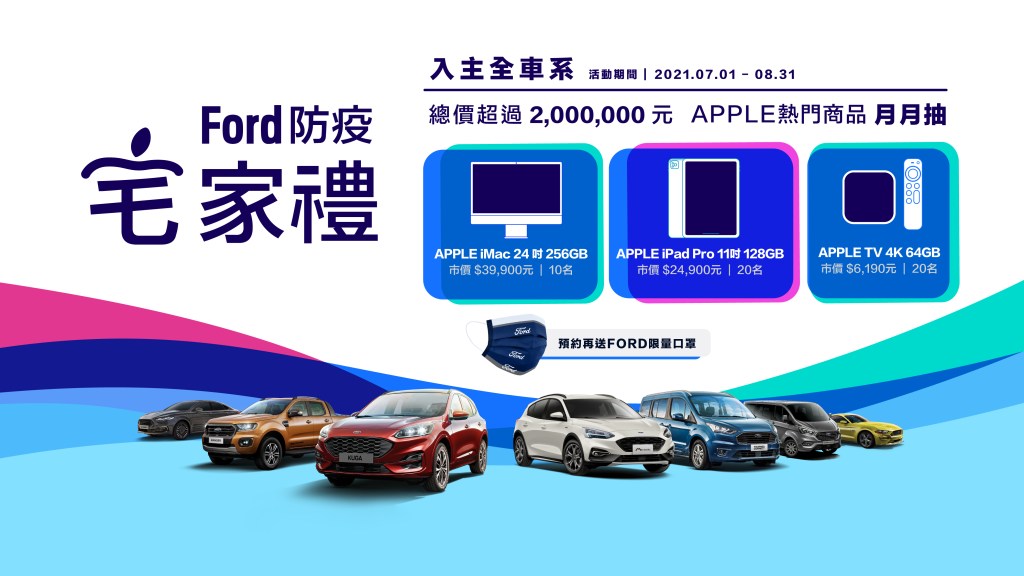 全台灣防疫三級警戒持續延長,為與全台灣車主共同守護家人與行車的安全,Ford打造安心服務環境與貼心回饋的心長在,在抗疫期間安心賞車、購車及擁車的每個環節,都持續高規格落實,共同打造防疫新生活。同時,為回饋消費者支持,Ford推出「防疫宅家禮」優惠活動,七月起入主Ford全車系,即有機會抽中Apple最新系列商品,包含:iMac(10名)、iPad Pro M1與APPLE TV 4K(各20名),活動持續至8月31日止,兩個月總計100名得獎機會,總價值超過200萬元。