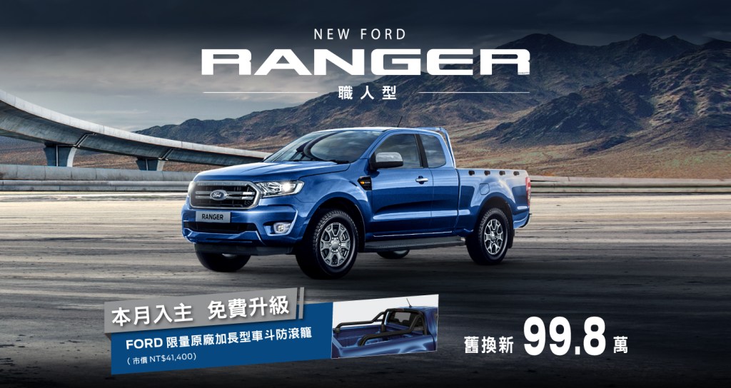 限量專屬套件升級即刻把握七月入主New Ford Ranger職人型,舊換新優惠價99.8萬,本月入主再享免費升級原廠加長型車斗防滾籠(市價NT$41,400),限量25組,職人專屬升級機會即刻把握。