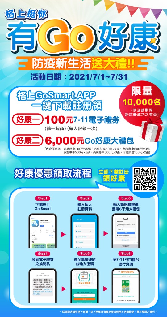 疫情限縮了民眾的移動範圍,裕隆集團旗下格上租車以實質優惠,相挺每一位在疫情期間仍需出門謀生、必要移動的辛勞工作者,即日起,只要註冊格上Go Smart APP,就能獲得100元7-11電子禮券,再加碼總價值6000元的折價券,用車Go好康!