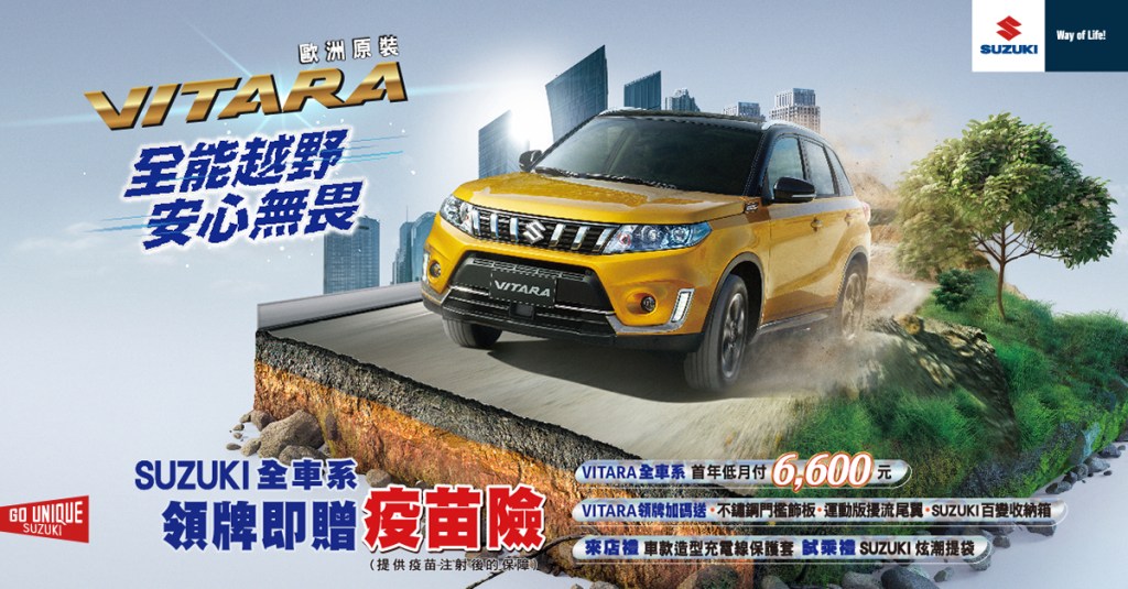 | VITARA | 首年低月付6,600元 *領牌加贈: 不鏽鋼門檻飾板 運動版擾流尾翼 SUZUKI百變收納箱 | 即日起 – 2021/07/30 |