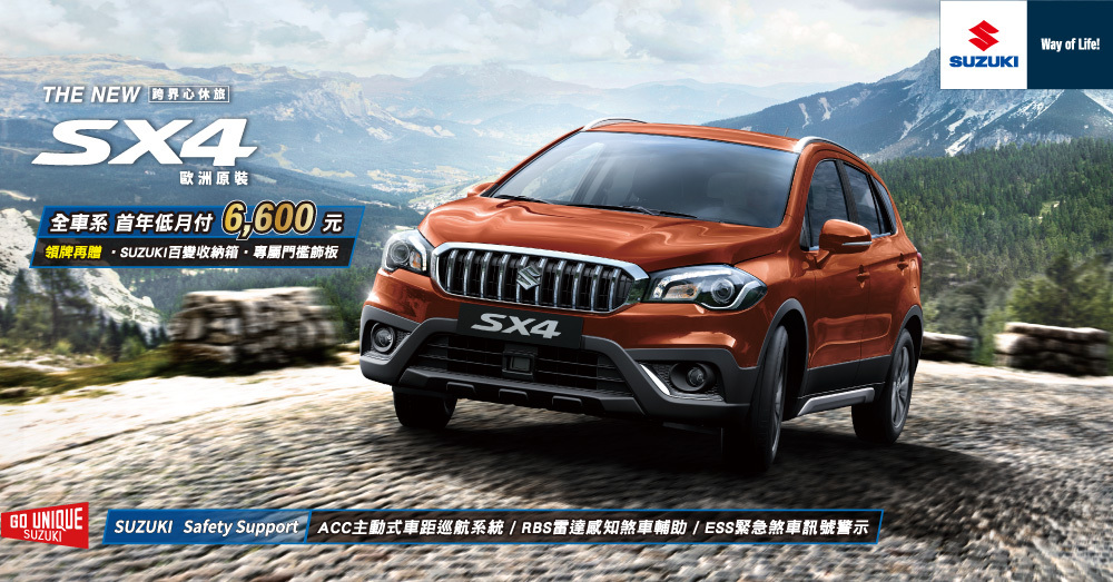 全新SX4搭載ACC主動式車距巡航系統及RBS雷達感知煞車輔助等,多樣且嶄新的智能安全科技,結合優雅的歐式設計及SUV剽悍外型。同時搭載SUZUKI新世代動力1.4 L BOOSTERJET渦輪增壓引擎的跨界休旅SX4,配備支援Apple CarPlay® 及 Android Auto™的多功能觸控式螢幕帶給台灣消費者更安心的駕馭心樂趣。