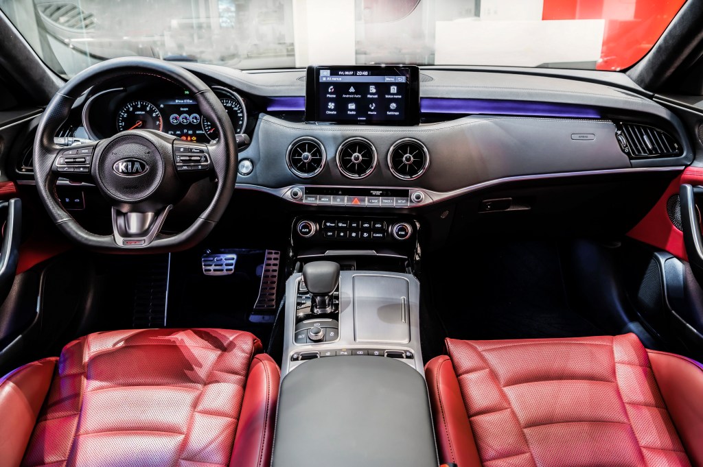為與KIA New Stinger的跑格底蘊相暉映,中控台和儀表板外以鋁合金、鋼琴烤漆與鍍鉻材質交錯搭配,並搭載七色座艙氣氛燈,完美融合現代科技與造車工藝,營造個人專屬風格的車室空間。此外,3.3 GT AWD車型更提供個性化選配,如爍黑跑格化內裝套件,奢華的Nappa麂皮內裝搭配紅色安全帶與車飾縫線設計,以面面俱到的頂尖姿態完美詮釋性能轎跑真義,演譯New Stinger的性能GT風範。