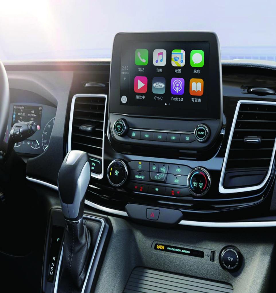 Ford Tourneo Custom福特旅行家8人座豪華型亦配置8吋懸浮式全彩觸控螢幕,搭配SYNC® 3娛樂通訊整合系統,可連結支援Apple CarPlay®及Android Auto™系統,支援語音聲控及緊急通訊救援系統,讓用車的旅人們更便利安全地與娛樂通訊生活保持無縫接軌與全時連線。