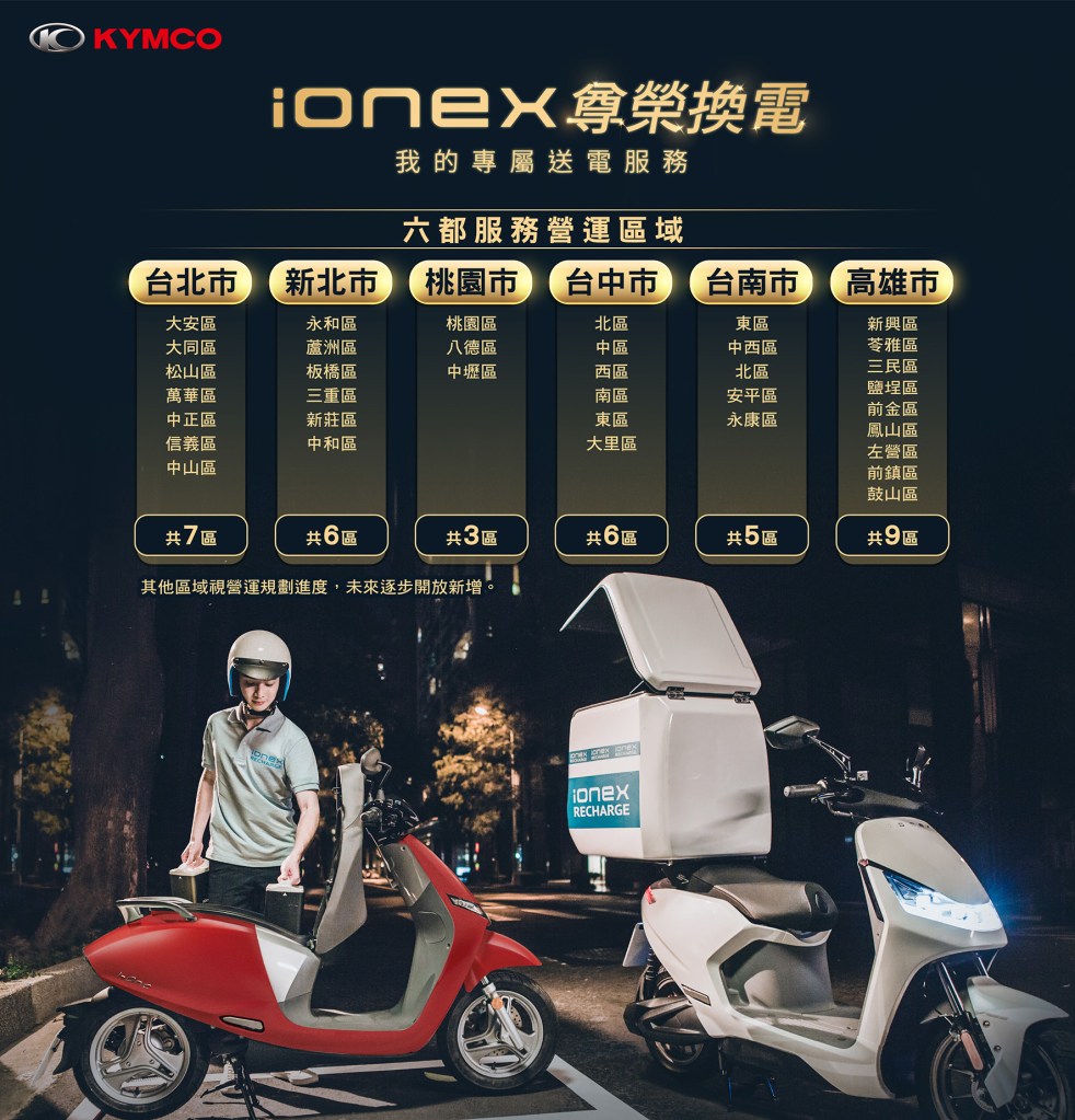 KYMCO「Ionex 尊榮換電」八月底正式上線,第一波根據人口數選定六都36個行政區,未來也會逐步擴增服務範圍,服務區包含「台北市」大安區、大同區、松山區、萬華區、中正區、信義區、中山區,共計7區;「新北市」永和區、蘆洲區、板橋區、三重區、新莊區、中和區,共計6區;「桃園市」桃園區、八德區、中壢區,共計3區;「台中市」北區、中區、西區、南區、東區、大里區,共計6區;「台南市」東區、中西區、北區、安平區、永康區,共計5區;「高雄市」新興區、苓雅區、三民區、鹽埕區、前金區、鳳山區、左營區、前鎮區、鼓山區,共計9區。
