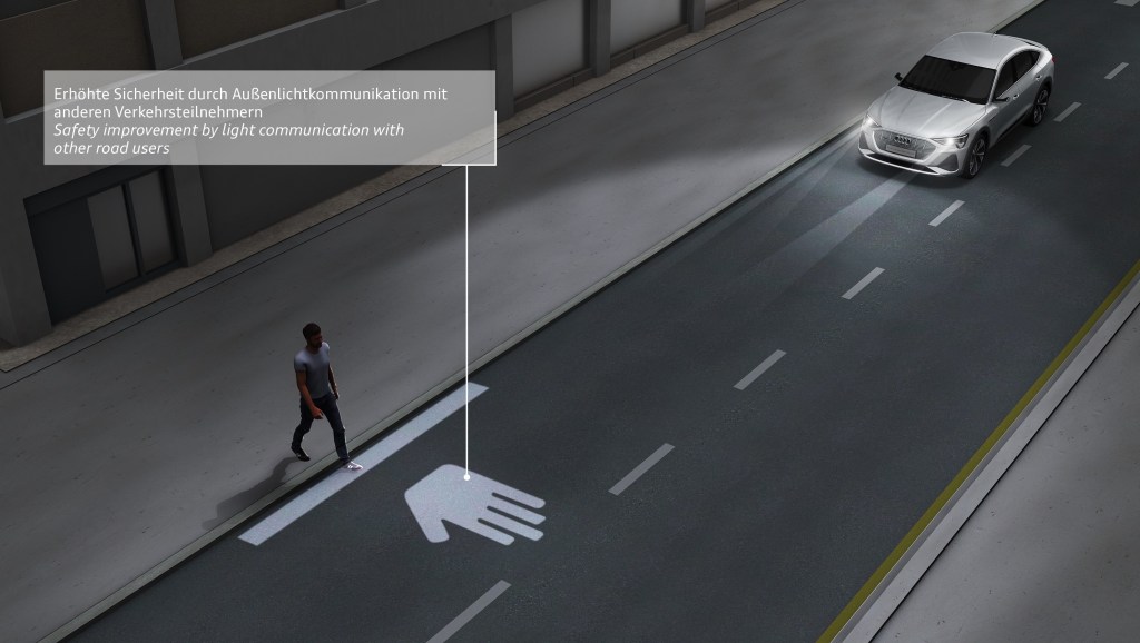2019年Audi將Digital Matrix LED 頭燈科技應用在全能休旅 Audi e-tron Sportback,透過核心「數位微鏡設備DMD(digital micromirror device)」技術,核心晶片包含一百萬個微鏡,而每個微鏡的邊緣長度僅為百分之幾毫米,透過靜電場的幫助下,單個微鏡每秒最多可置動 5,000 次,因此能依據路況將光束通過透鏡引導至道路上或被吸收以掩蓋光束區域。消費者可透過選配體驗此項全新技術,透過車內MMI 燈光造型選項功能,讓動態離家與返家燈光投射如舞台般絢麗多個性化的展演。其二此技術可讓近光燈以極高的精密度辨識光源需求,適時準確地遮蔽其他干擾光源,在狹窄道路或公路施工區,頭燈會自動將燈光聚焦至行人上,從而減少忽略車道附近行人的行駛危險。