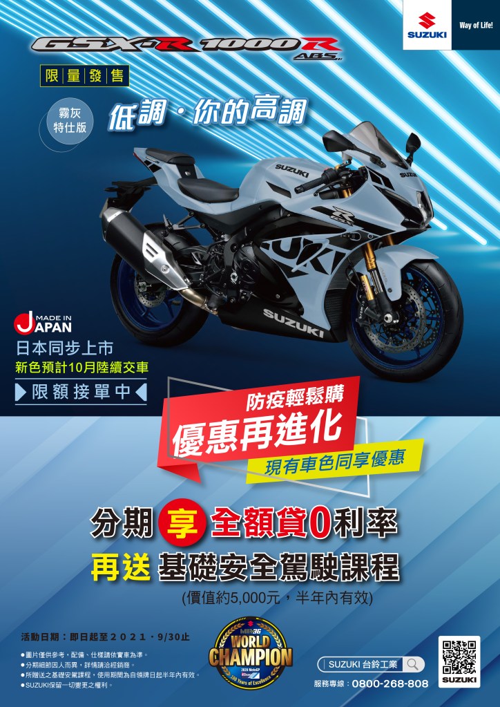 歡慶新色上市與因應政府微解封,即日起至2021/09/30止,購買GSX-R1000R全車系,分期全額貸0利率,讓您輕鬆入手頂級賽道旗艦機種,此外凡購買SUZUKI進口機種,即享價值5,000元之基礎安全駕駛訓練課程,讓您買得安心,騎得放心;由於疫情影響海上航運作業與台灣港口貨物入港時程,即日起預購GSX-R1000R,預計2021年10月交車,及早訂購及早享受。