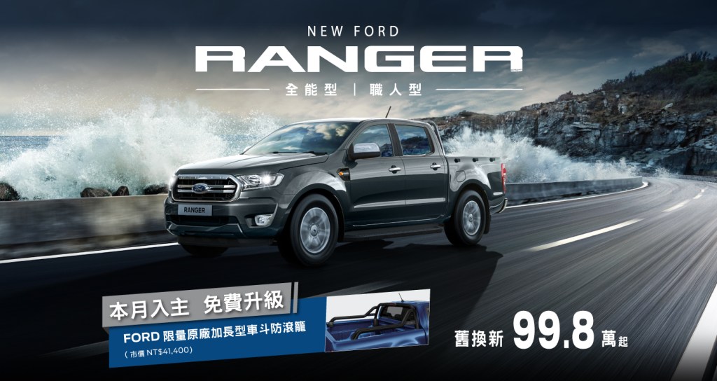 | Ford Ranger職人型/全能型 | 舊換新優惠價99.8萬起免費升級原廠加長型車斗防滾籠(市價NT$41,400),數量有限,送完為止 |