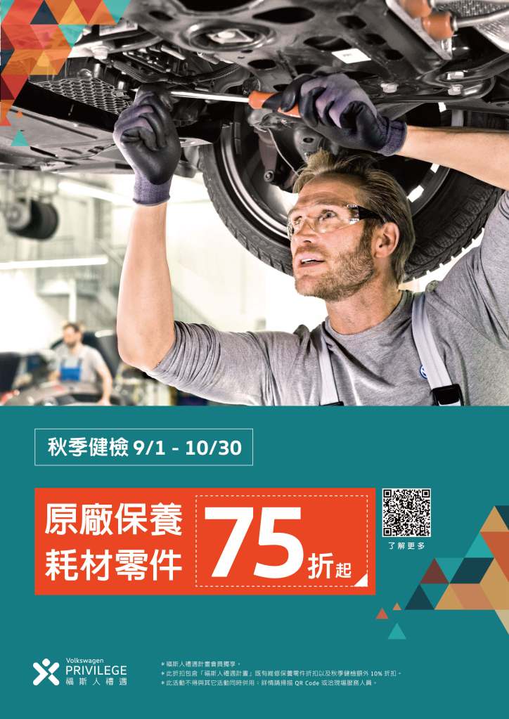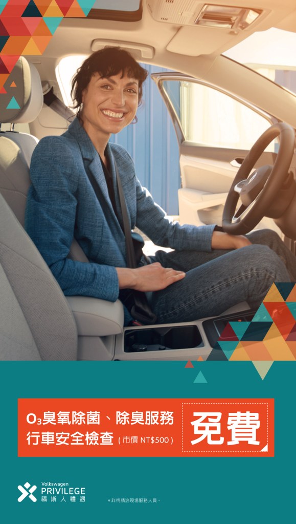 - 即日起至10月30日止,Volkswagen秋季健檢服務提供免費O3臭氧除菌、除臭服務及行車安全檢查,「福斯人禮遇計畫」會員更可獲得原廠保養耗材零件75折起和自費更換四條馬牌輪胎享一條輪胎免費,讓愛車保持最佳車況。
