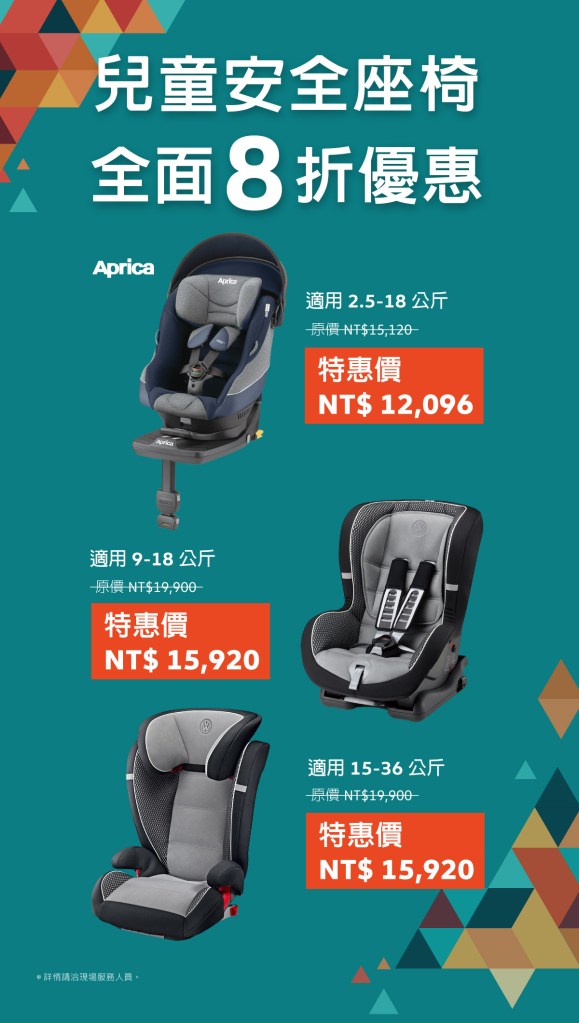 - Volkswagen e-shop原廠精品配件網「和孩子一起FUN」,推出指定原廠精品8折起、兒童安全座椅全面8折優惠,讓一家大小出遊好玩又安心。