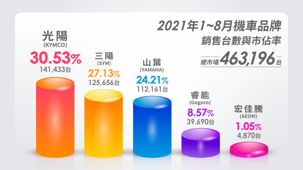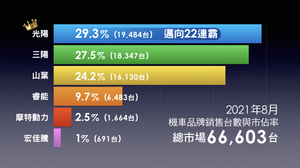 疫情微解封,台灣民眾報復性消費風潮也吹向機車市場,一掃五六月因疫情腰斬業績的市場陰霾,八月總市場銷量達66,603台接近疫情前今年單月最高峰3月70,753台。龍頭品牌KYMCO光陽工業仍以19,484台領牌數稱霸群雄,銷售量大贏一路纏鬥的SYM三陽18,347台,八月29.3%市佔穩坐龍頭,全年度以30.53%市佔居冠,是唯一車廠站上市佔率30%的機車業者。除了買氣大幅回升,KYMCO暸解疫情重創國民經濟,民眾傾向購買實用划算型的機車款式,故率先響應政府更早推出振興方案體貼消費者輕鬆購車,KYMCO率先宣布「國民神車GP 125」全民同價42,800振興優惠,因此國家六期環保GP125銷量飆漲161.9%,國家七期環保GP 125 爆升256.5%,六期與七期都是國家認證的新環保機車,買氣熱烈大回籠,也帶動KYMCO光陽全車系銷售力道,衝出45%成長率,傳統淡季不淡,機車旺季銷售戰提前開打!
