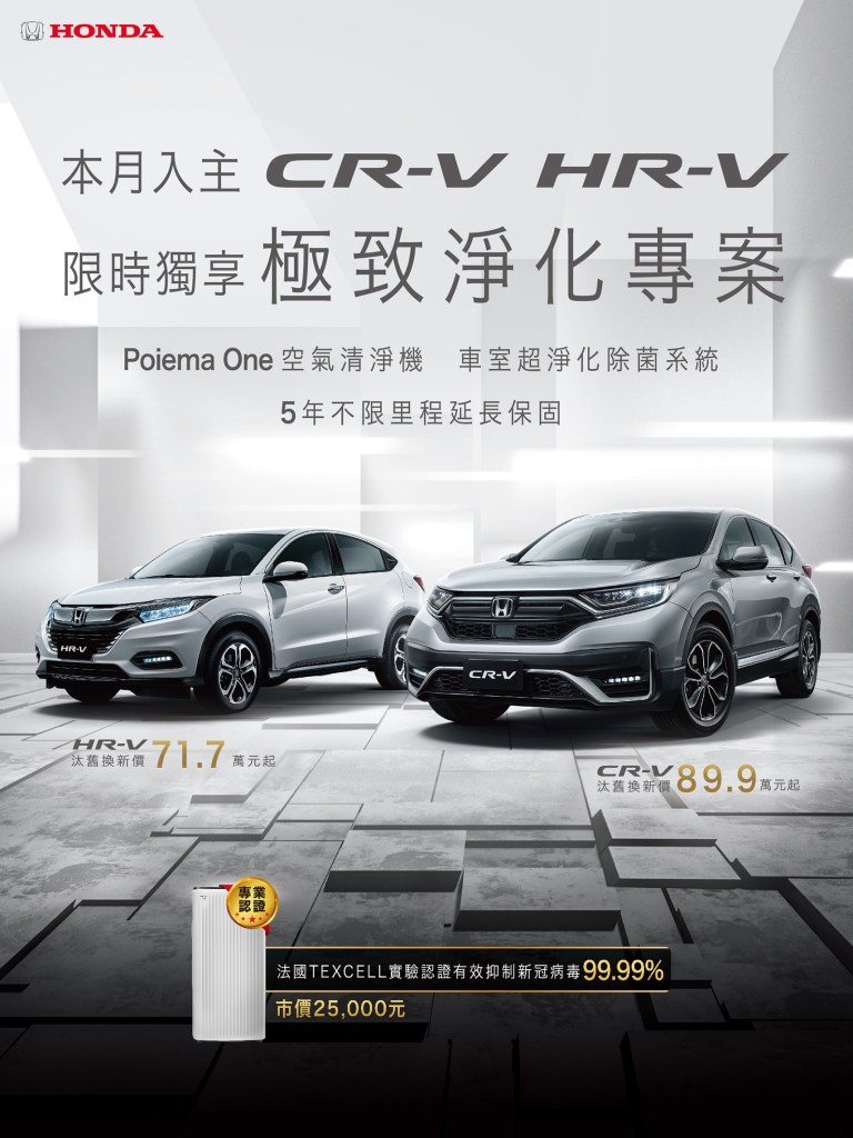 本月入主CR-V、HR-V指定車型限時獨享多重好禮,可免費升級法國TEXCELL實驗認證有效抑制新冠病毒99.99%之Poiema One空氣清淨機、車室超進化除菌系統及 5年不限里程延長保固。誠摯邀請廣大消費者蒞臨,或電洽Honda全方位顧客服務專0800-666-789、登入Honda Taiwan官方網http://www.honda-taiwan.com.tw/auto了解更多新車資訊及超值禮遇方案。