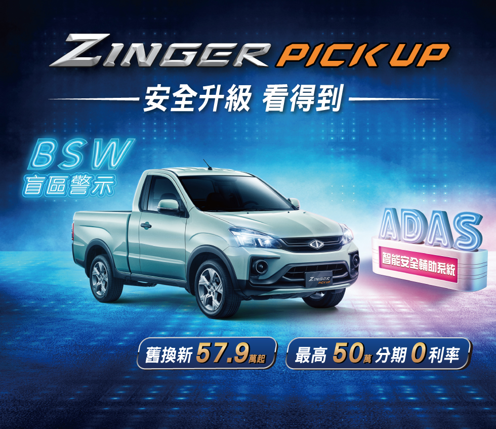 | ●ZINGER P/U 精采型 62.9萬 晶鑽型 66.9萬 | 全新ZINGER PICK UP搭載智能駕駛輔助系統(ADAS)及盲區偵測警示系統(BSW),採用一體式鈑金貨台設計,搭配耀眼的日行燈與17吋鋁合金輪圈,舒適性、安全性、專業質感大升級! 專屬「青松綠」新車色,增添商場活力色彩,讓商車表現更多彩多姿!舊換新57.9萬元起。 |