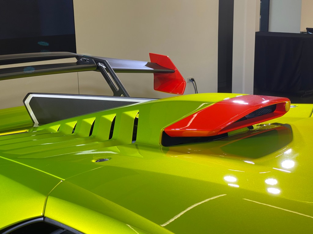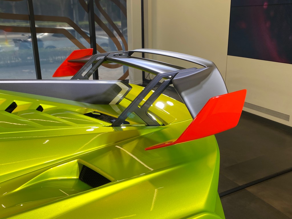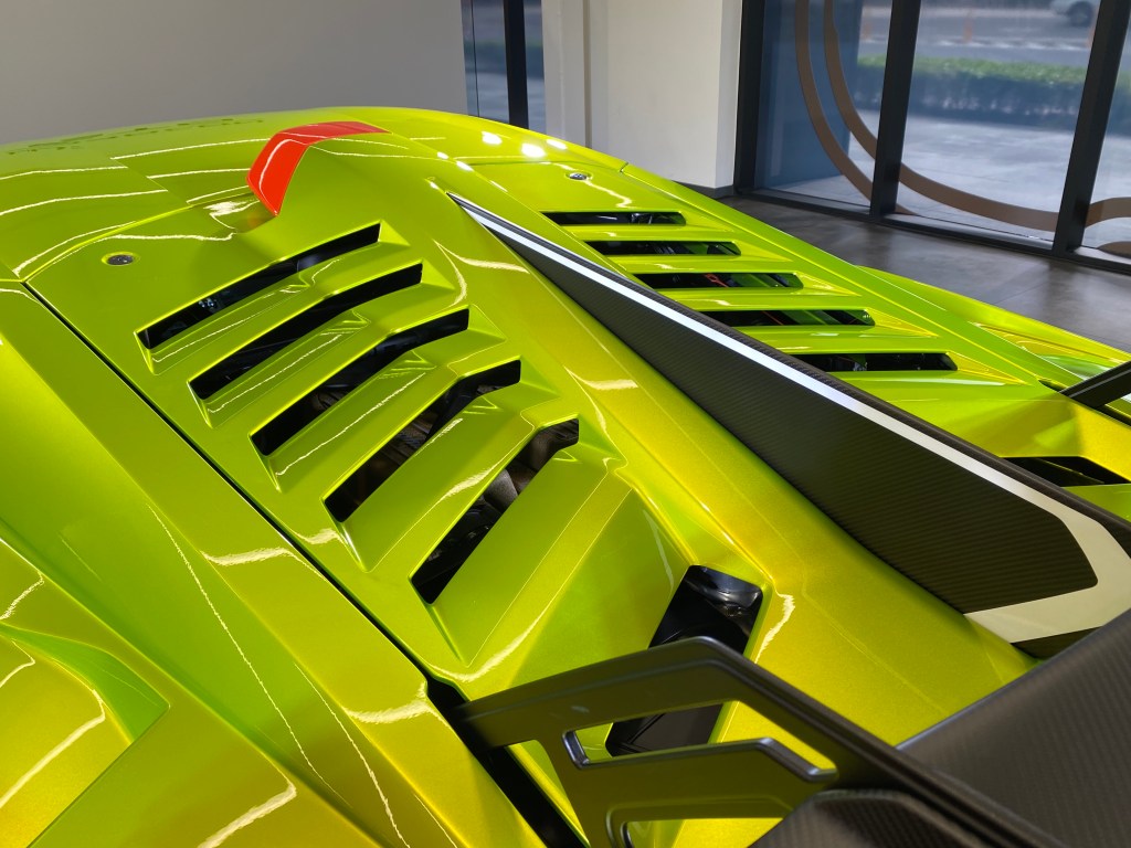 車尾設計絕佳詮釋無懈可擊的空氣動力系統。取於Super Trofeo EVO的新型後葉子板,在減少迎風面積並降低風阻的同時,提升尾部下壓力,增進車輛整體空力效益;位於葉子板上的NACA進氣口,以更短的進氣通道為引擎室導入氣流,可減少30% 的靜壓力損失。重新設計的引擎蓋整合車頂進氣口,提升引擎冷卻效力,車頂進氣口造型往車尾延伸,形成彷若鯊魚鰭的中央背鰭設計,有助於提升車輛高速行駛及進彎時的穩定性,進一步優化整體動態性能。可調節式尾翼,可依據不同駕駛條件進行三段調整,以達到最合適的空力平衡狀態。