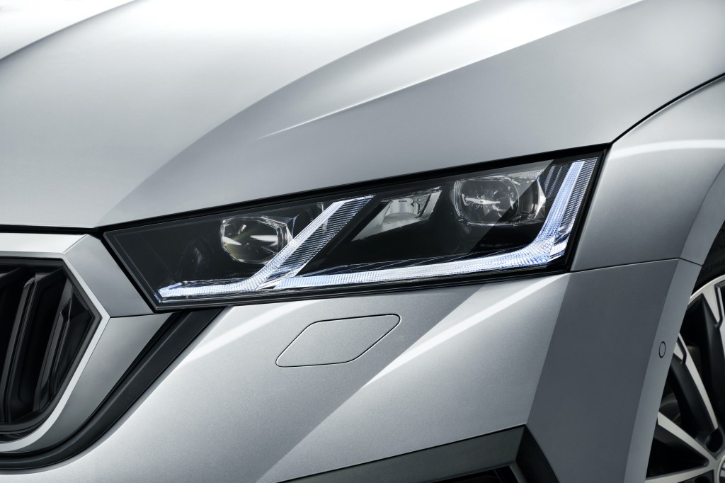 OCTAIVA在第四代全新大改款更彰顯其霸氣動感的造型。以雙門跑車設計理念打造的OCTAVIA承襲之前的雙燈組造型但改以LED頭燈組以燈條方式營造出雙燈區,並搭載Matrix LED智慧複眼頭燈科技,讓這項照明界最高規科技首次出現在此一級距。更為低斜前伸的車頭,配上寬開口的水箱罩、跑車腰線, 讓這款全新OCTAVIA再次成為性能與動感的化身,並打造出絕佳的風阻係數cd值0.24 (五門斜背)與0.26 (五門Combi)。而原來較為平整的前保桿也因應飛翼式水箱罩的造型變化將左右兩側修改得更加立體。配合新車頭造型,前保桿化身為X型,將水箱罩、氣壩、LED頭燈以及前霧燈恰好各據一方。接續著環繞車身的龍捲風特徵線將視線轉至車尾部分,全新OCTAVIA採用家族最新的英文字母取代之前的Logo識別,貼合在行李廂開口的LED尾燈組則修改得較為狹長,將蓄勢待發的氣勢表露無遺。