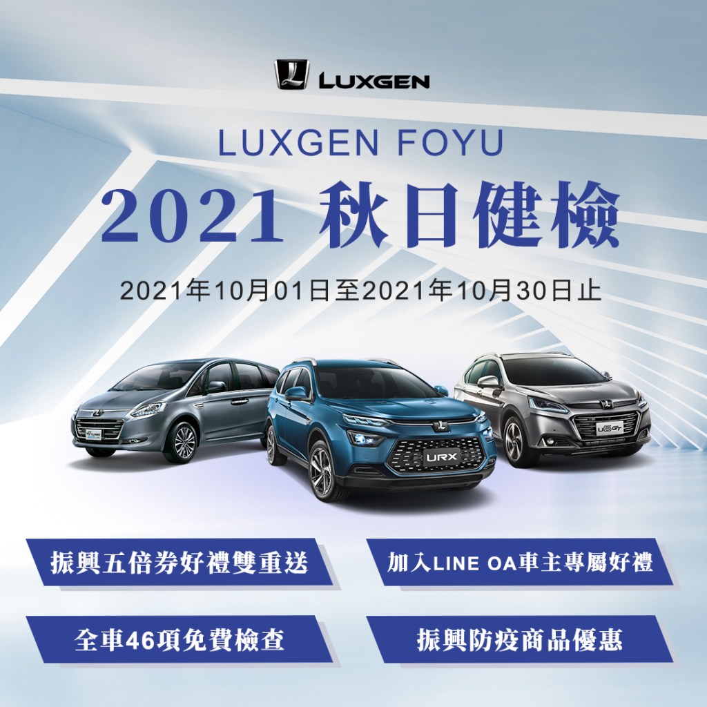 2021 LUXGEN FOYU 秋日健檢項目除了免費各項行車安全檢查,包含:底盤、輪胎、前瞻科技、引擎室檢查等共46項免費專業檢測;同時,更提供防疫安心守護再升級優惠商品,包含:PM2.5健康對策濾網、茶多酚負離子PM2.5空調濾網、車室循環消毒套餐、二代活氧離子空氣淨化器等多項優惠選擇;此外,LUXGEN為了感謝廣大車主的支持與肯定,現正祭出多項指定零配件嘉惠所有車主,歡迎所有車主們趁著秋日健檢的機會提前預約檢查愛車,讓車主及家人們皆能感受LUXGEN最安心與便利的用車生活。
