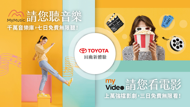 TOYOTA為創造顧客回廠保養維修時的驚喜體驗,即日起與台灣大哥大旗下影音平台myVideo及音樂平台MyMusic合作,於全台服務廠及保修站顧客休息室提供TOYOTA車主「三日影劇免費看」及「七日音樂免費聽」的服務。