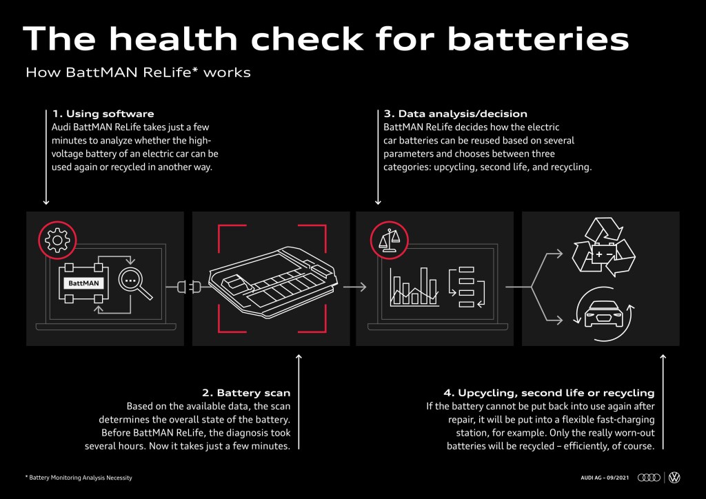 The new analysis software BattMAN ReLife checks their state of health in just a few minutes. Starting immediately, the quick check system will be used as a means of initial diagnosis in battery recycling at the pilot plant that Volkswagen Group Components has been operating in Salzgitter since the beginning of the year. The first version of the BattMAN (Battery Monitoring Analysis Necessity) software was developed by the Audi Brussels quality management department for the quick and reliable analysis of Audi e-tron’s high-voltage battery. It is already in use as a diagnostics tool for several brands of the Volkswagen group.