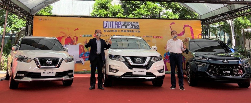 「發票登錄抽汽車活動」預計在今年12月、明年1月以及2月,依序抽出X-TRAIL、KICKS 與URX汽車大獎(每次抽出一輛),詳細抽獎活動辦法請上「新北振興加倍奉還」官方網站(https://double.ntpc.gov.tw/)。