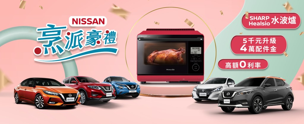 裕隆日產汽車持續追求顧客滿意,提供高品質車款與服務,為讓所有支持NISSAN的消費者於歲末時節能夠輕鬆入主NISSAN優質車款,自10月30日起至11月30日止,限時推出「NISSAN烹派豪禮」購車優惠專案,凡入主NISSAN國產全車系及進口車款NEW JUKE,即可獲得料理神器SHARP Healsio 水波爐 (型號AX-AS6T(R),建議售價27,900元) 乙台,再享5千元現金(或等價振興券)升級4萬配件金、高額分期0利率、舊換新5萬元優先領,國產車ALL NEW SENTRA、KICKS、X-TRAIL、TIIDA更享68無限里程延長保固等超狂烹派豪禮,讓消費者輕鬆入主NISSAN,同步享受健康自煮生活。
