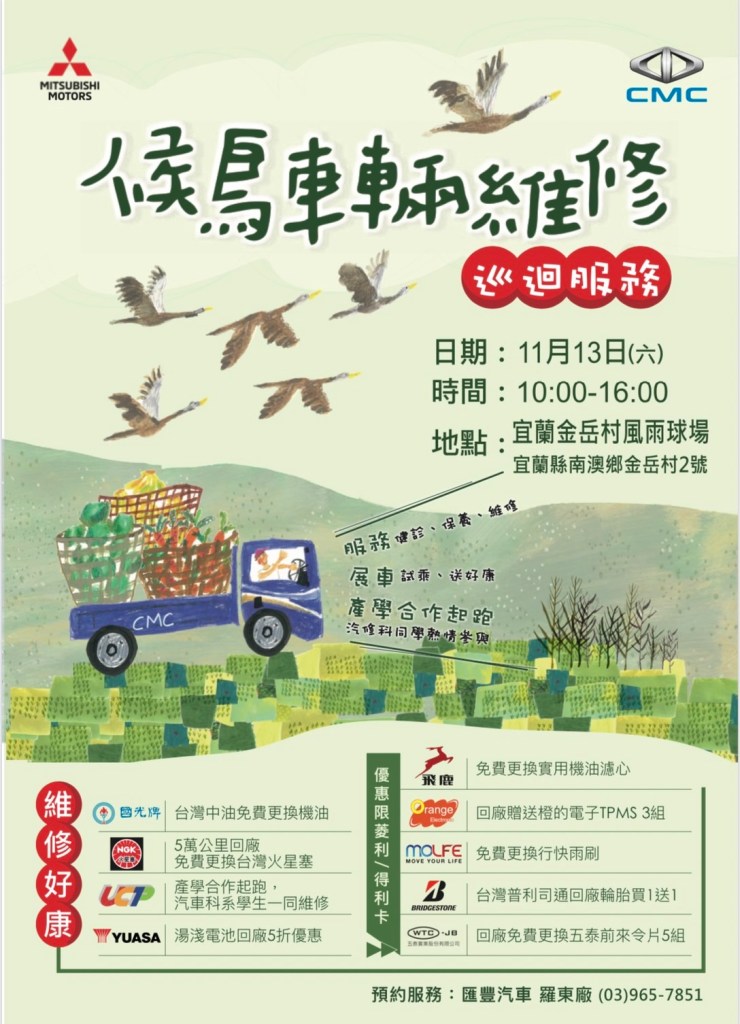 2021年11月「候鳥車輛維修巡迴服務」前進宜蘭金岳部落,這也是「候鳥健檢」展開以來,於宜蘭偏鄉舉辦的第三場公益場活動。今年公益場活動在匯豐汽車及「中華汽車協力會」的支持響應下,除延續原有「台灣普利司通輪胎回廠買一送一」、「湯淺電池回廠5折」、「行快雨刷免費更換」、「台灣中油機油免費更換」、「實用機油濾芯免費更換」、「5萬公里回廠免費更換NGK火星塞」及「回廠免費贈送橙的電子TPMS」(限量3組)等維修好康,再加入「五泰來令片免費更換」服務,以完善的檢修服務,共同守護偏鄉車主行的安全。