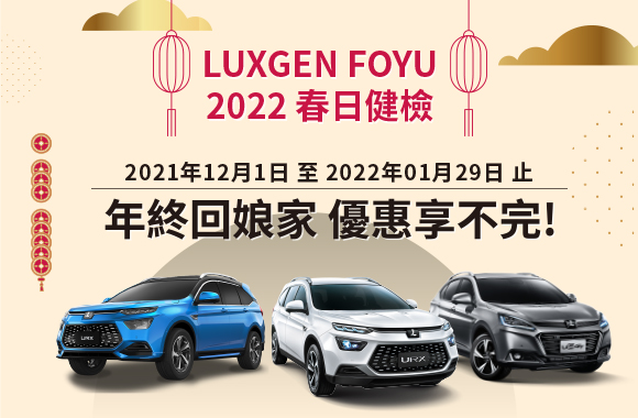 LUXGEN因應即將到來的農曆春節假期,貼心為車主的行車安全做足準備,自2021年12月1日至2022年1月29日止,正式展開2022「LUXGEN FOYU春日健檢」(1)活動!為了讓廣大車主們能夠安心出遊行車有保障,於活動期間內預約回廠進行車輛整備,免費可享高達46項行車安全檢查,包含前瞻科技、引擎、剎車、輪胎、底盤等全車專業檢查,以及鈑噴優惠、專業汽車美容等多項原廠專屬服務。LUXGEN誠摯邀請車主及早預約回廠進行愛車健檢,給予乘員們自由自在、舒適無虞的幸福時光!