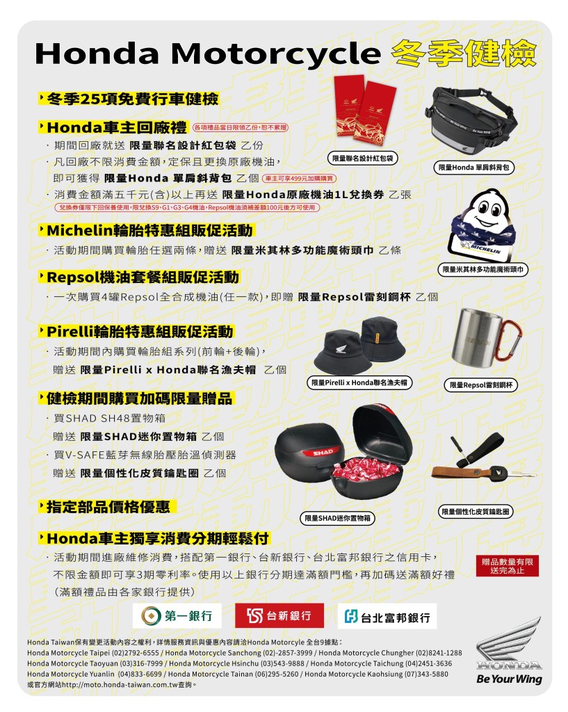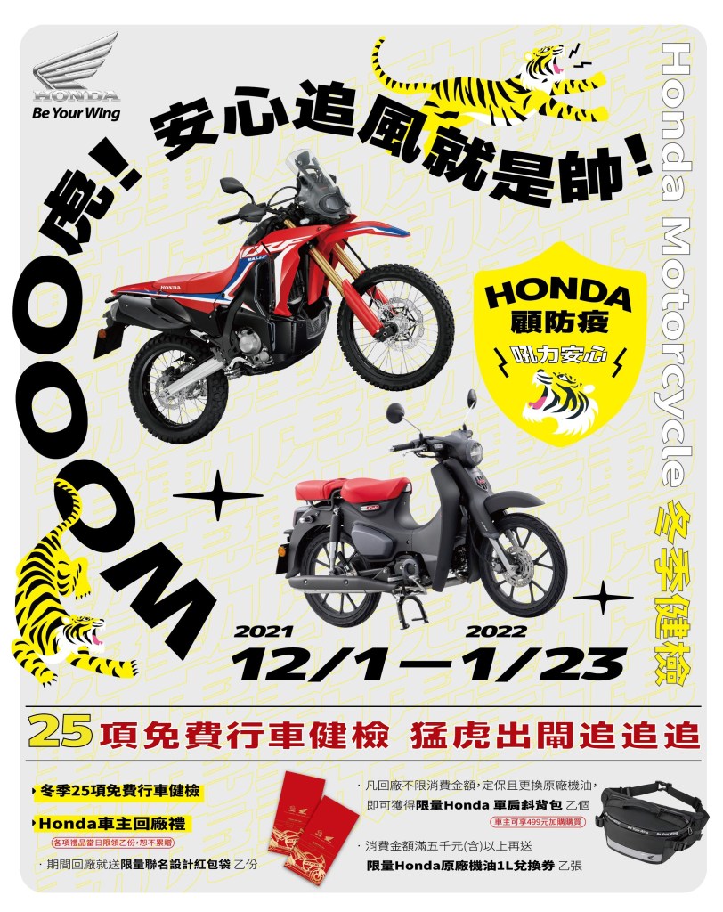 Honda Motorcycle為了持續實現「Be Your Wing」的品牌精神,以獨有的6S服務機制,提供二輪業界內最完整的服務建構與承諾,致全力讓所有熱愛Honda二輪的顧客滿意。為讓親愛的車主有著更全面的服務,Honda Taiwan將於2021/12/1到2022/1/23於各區Honda Motorcycle經銷據點舉辦 「Wooo虎!安心追風就是帥!」免費健檢活動,將提供免費25項行車安全檢查以及回廠好禮、消費滿額禮、定保換油禮等,另外還有Repsol機油、Pirelli、Michelin輪胎販促優惠活動等。敬邀親愛的車主安心回到Honda Motorcycle保養愛車,共創充滿安心且喜悅的重機生活,一同帥氣追風迎虎年。