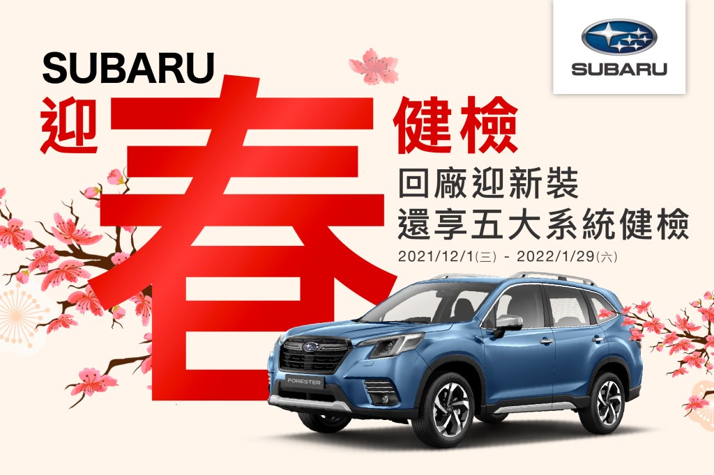 隨著國內疫情趨緩,民眾的生活也逐步回歸正常,用車需求也大幅提升。為此,SUBARU特別為車主規劃「SUBARU新春健檢」,即日起至2022年1月29日止,提供五大系統共36項免費健檢,以及車體美容與原廠零件優惠回饋,單筆消費滿額再享好禮。SUBARU期盼在此歲末與即將到來的新春期間,提供車主安心的行車體驗,讓愛車容光煥發迎新春。