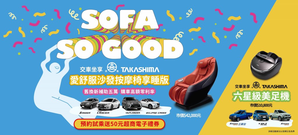 | 乘用車外促 | 買三菱!SOFA SO GOOD 本月入主指定車款送TAKASHIMA高島愛舒服沙發按摩椅:凡本月購買且領牌GRAND LANCER、OUTLANDER、ZINGER、ECLIPSE CROSS、任一車種,即可獲得【TAKASHIMA高島愛舒服沙發按摩椅】。(市值42,000元)本月入主指定車款送TAKASHIMA高島六星級美足機:凡本月購買且領牌COLT PLUS、ZINGER PICK UP任一車種,即可獲得【TAKASHIMA高島六星級美足機】。(市值10,800元) |
