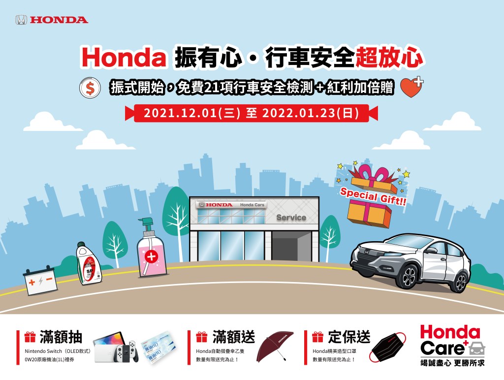 Honda Care+『振有心,行車安全超放心』,活動期間自2021年12月1號起至2022年1月23日止。Honda Taiwan誠摯邀請車主預約回廠,於活動期間內消費還可參加百萬好禮抽獎活動,獎項包含Nintendo switch & Honda 0W20原廠機油劵(1L)。此外,消費滿6,000千元以上,加碼再送Honda自動摺疊傘乙支,數量有限送完為止!更多活動資訊、與優惠內容,請洽Honda Taiwan 客服專線:0800-666-789或登入活動網站https://www.hondataiwan.com.tw/SP_D/hondacare2021winter/ 或洽全國Honda Cars查詢。敬邀車主預約回廠,Honda Cars全國各服務據點將竭誠為所有車主服務。