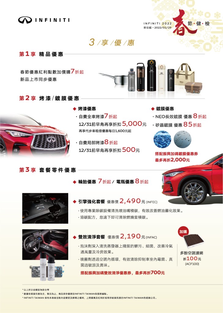 INFINITI TAIWAN 即日起至 2022 年 1 月 29 日止,展開 2022春節免費健檢活動,活動期間預約回廠即享5大系統42項免費健檢服務,包含引擎、傳動、剎車、動力、電瓶、燈光及輪胎等安全檢測,讓車主安心「迎新春,賀新年」。