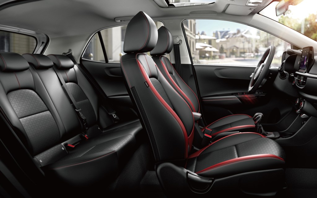 The Picanto內裝採用多樣化材質堆疊,展現質感豐富的空間氛圍,並使用與旗艦轎跑 Stinger 同源的D-Cut跑格化方向盤、皮質排檔頭,與鋁合金油門/煞車踏板,嶄露傲視同級車款的設計與配備等級。不僅如此,X-line及GT-line 透過不同搭配顯露個性:X-line 使用綠色漸層線條在灰白色烤漆門飾版豐富層次,與黑灰雙色皮革座椅的綠色縫線相互呼應;GT-line則以紅色線條畫過黑色門飾板,與黑紅雙色皮椅、紅色車縫線譜出運動跑格。
