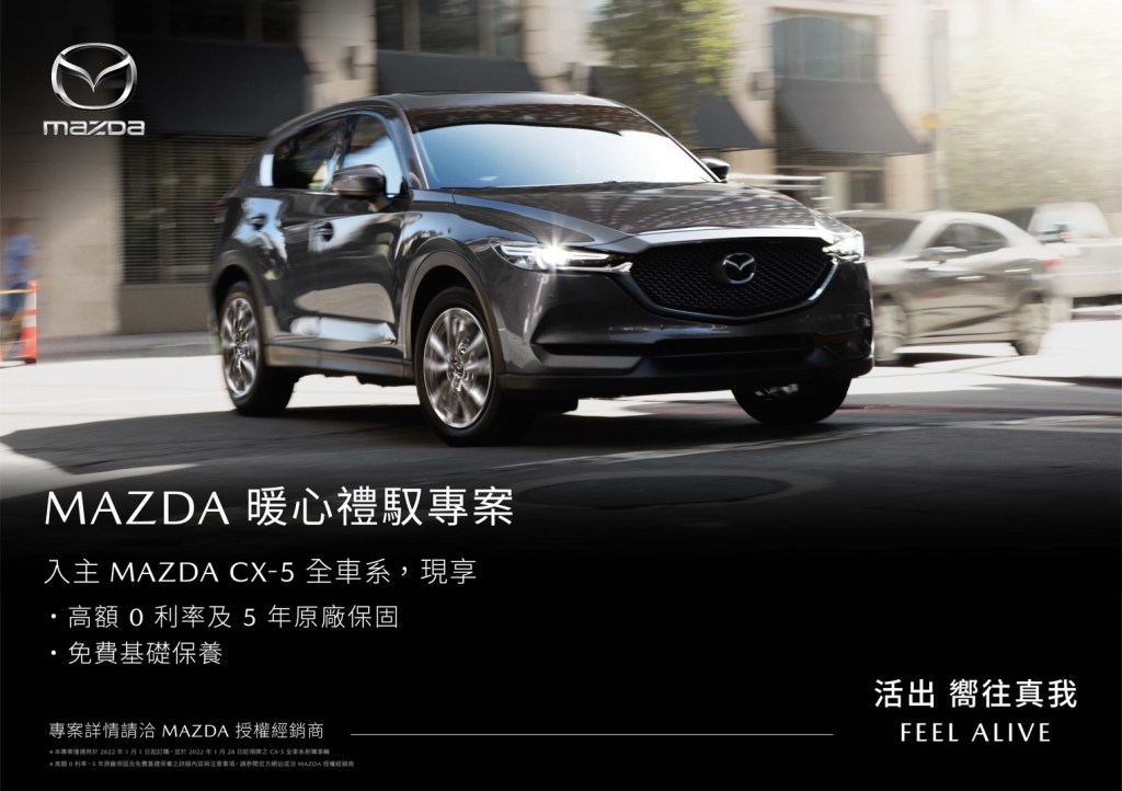 MAZDA CX-5不斷洗練進化,才能呈獻予車主完美成熟的最佳樣貌。CX-5俐落優雅的姿態襯托車主品味獨到的沉穩魅力。雙前座導流式通風座椅與BOSE® 環繞音響系統更顯內裝質感細膩,而全面強化的i-ACTIVSENSE 主動安全科技,360°環景輔助系統以及倒車煞車輔助系統 (SCBS-R),給予車主完備的防護,提供自在安心的駕馭體驗。MAZDA期盼新的一年繼續陪伴所有車主實現自我獨特目標,感受充滿活力與笑容的耀眼生活。欲了解更多新車相關訊息與規格配備,以及「暖心禮馭」專案詳情與相關條款細節,歡迎造訪 MAZDA 官方網站(https://www.mazda.com.tw/)、「暖心禮馭」專案專屬頁面(https://contact.mazda.com.tw/testdrive_arrive/Jan2022.aspx)或親臨MAZDA全國展示中心。