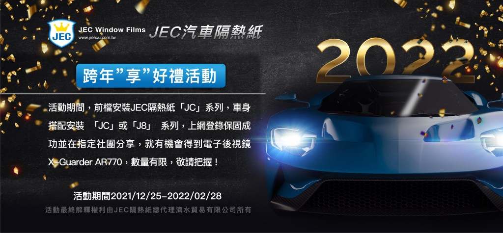 JEC隔熱紙為美國FGIA(Fenestration and Glazing Industry Alliance)窗玻性能工業聯盟發展成員,2010年全球發行第一款高隔熱、高清晰、高透視汽車專用陶瓷隔熱紙JC系列,於2016年推出第一款霧度最低的雙奈米陶瓷(Carbon+ATO)隔熱紙BA系列,2020年推出最適合亞熱帶、熱帶地區適用防曬隔熱紙J8系列黑色陶瓷隔熱紙。全系列產品經過歐盟ROHS無毒認證、符合日本JICQA質量保證 、日本JAB適合性協會認定、汽車VOC室內乘車品質規範、澳州政府ARPNSA評鑑為優質防曬隔熱紙,JEC隔熱紙持續開發、增進改良產品,為千萬車主打造舒適無礙的駕乘空間,建立健康的車室環境、提供更安全的行車體驗,現在選擇JEC隔熱紙更享有5年原廠保固服務! 「指定安裝抽好禮」活動即日起至2022年 2 月 28 日止,週週抽、週週送!活動期間內於JEC隔熱紙正式授權經銷商,為愛車安裝指定(前擋JC系列+車身JC系列,或前擋JC系列+車身J8系列)隔熱紙,安裝現場填寫「回執聯」後「上網登錄保固」,並在任一「FB汽車社團」分享體驗文(至少附3張照片),並hashtag 「JEC汽車隔熱紙,即達成遴選資格,參加X-Guarder AR770電子後視鏡抽獎活動!敬請車主們把握難得機會!欲知更多活動或產品資訊請上官方網