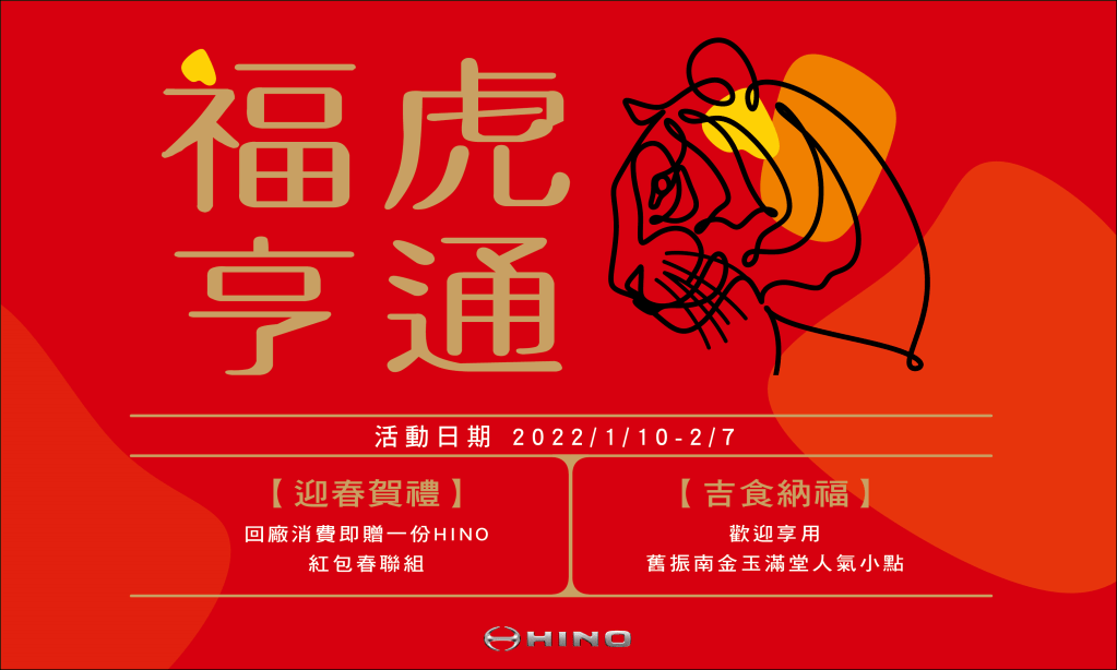 和泰汽車代理的TOYOTA與HINO商用車品牌在逆境中銷售創新高,2021年3.49噸(含)以上商用車領牌9,422輛,市占率33.2%,首登3.49噸(含)以上商用車總市場銷售冠軍,刷新和泰商用車在台灣的新紀錄,成為台灣商用車新霸主。為感謝廣大車主的支持,自2022年1月10日起至2022年2月7日止,舉辦「福虎亨通迎新春」活動,活動期間延續歲末免費26項安全健檢,用專業守護車主的行車安全。 此外,HINO與車主一同迎接嶄新的2022,凡於活動期間回廠消費結帳即贈送「迎春賀禮」(紅包六枚、春聯一對)一組,紅包春聯以虎為設計搭配春節喜氣元素,為大家帶來出運的一年,贈品數量有限,送完為止。並於顧客休息室提供「吉食納福」舊振南金玉滿堂迎春小點,邀請車主回廠享用年節點心感受年節氛圍,吃甜甜過好年。<註:車主含HINO全車系及TOYOTA HIACE、GRANVIA、COASTER >