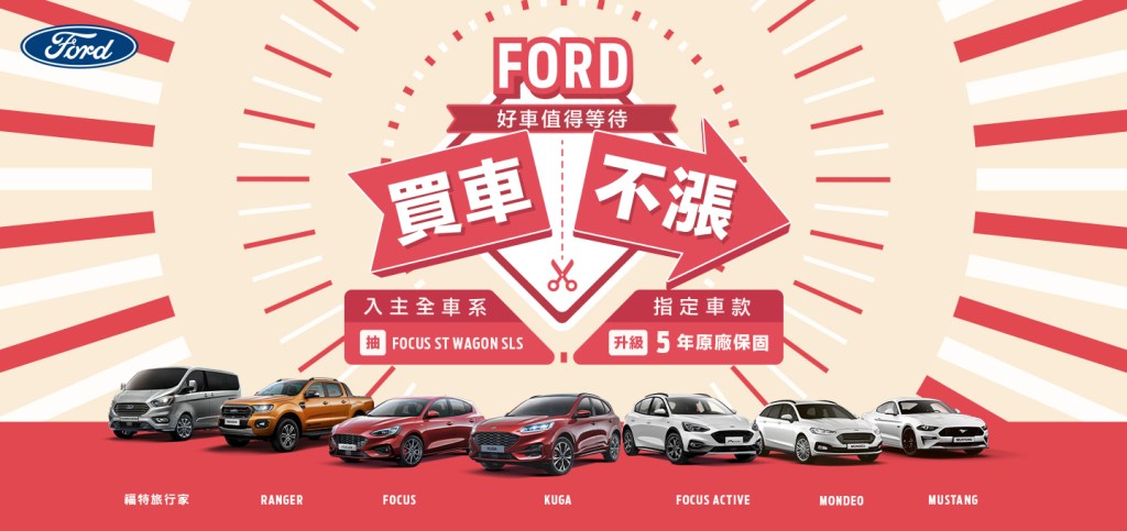 | Ford 全車系 | 活動期間:即日起至2022年3月31日止 於各Ford經銷據點完成Ford任一新車款領牌,即具備乙台Focus ST Wagon – SLS Edition之抽獎資格 |