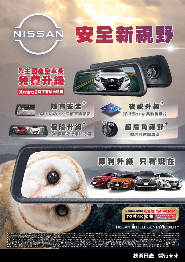 裕隆日產表示,國人駕駛時常因盲區死角影響行車安全,因此自1月29日起至2月25日止,推出「NISSAN 安全新視野」購車優惠專案,凡入主NISSAN國產全車系,即可免費升級「Xmiro2 電子智慧後視鏡」(價值19,800元)。