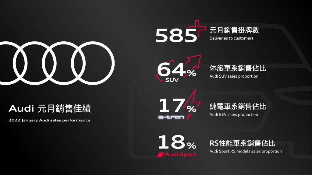 新世代Audi Q3、Q5 及Q7等多元休旅車款接續到位,完整四環休旅陣容不僅滿足台灣消費者休旅車強勁購車需求,亦為台灣奧迪2022年元月銷售量帶來助力,寫下元月在台銷售歷史新高,元月Audi總掛牌數達585輛,休旅車系銷售佔比更一舉高達64%;除休旅車系之外,針對國內詢問度快速成長的純電產品,Audi e-tron全能電旅及Audi e-tron GT純電轎跑兩大車系亦獲消費者青睞,銷售表現亮眼佔整月車型銷量比17%;而旗下年輕多元的Audi RS高性能系列車款亦創佳音,銷售佔比一舉衝達18%,於開春之際寫下正成長佳績。
