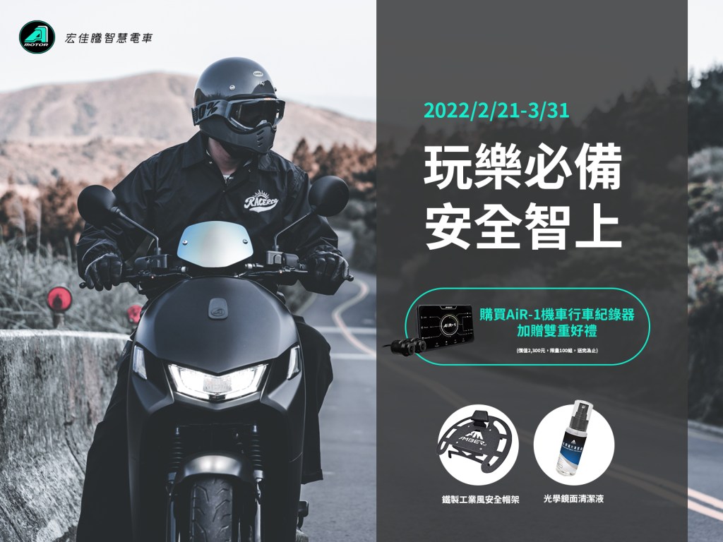 而針對想購買智慧電車作為最佳拍檔的外送平台夥伴,宏佳騰智慧電車也推出2月28日前購買Ai-1或Ai-3任一車款(包含Ai-1 Sport+),即可享有早鳥三好禮或原廠精品貨架組二擇一購車方案,讓您牽新車就可擁有外送載貨好幫手的高強度貨架配件。歡慶新車上市並提供消費者更完整的安全體驗,3月底前選購AiR-1機車行車紀錄器,再贈送總價值2,300元的安全帽架與光學鏡面清潔液,限量100組。即日起至全台智慧門市試乘體驗並填寫問券,還可免費得到只送不賣、輕鬆拎著走的「品牌飲料提袋」乙個,數量有限、送完為止。