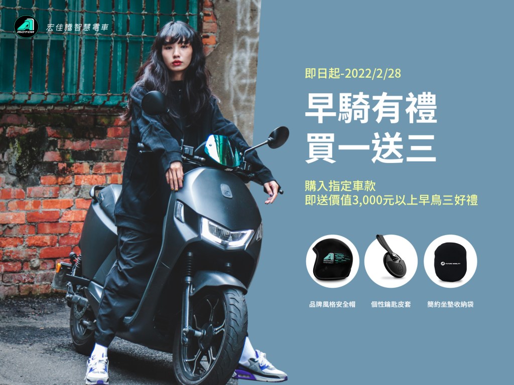 此外,各縣市政府補助陸續公告之際,宏佳騰智慧電車與消費者站在同一線加碼祭出多項購車優惠,2月28日前購買Ai-1 Sport+、Ai-1 Sport/ABS、Ai-1 Comfort+、Ai-1 Ultra ABS與Ai-3 Comfort系列任一車款,即贈總價值3,000元以上包含「品牌風格安全帽」、「簡約坐墊收納袋」跟「個性鑰匙皮套」的早鳥三好禮,還可搭配全車系指定信用卡最高30期零利率,最低月付不到2,000元將宏佳騰智慧電車騎回家。