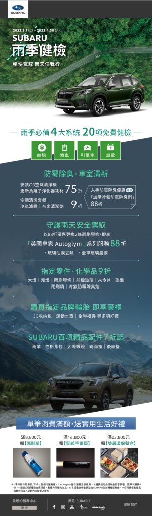 「SUBARU雨季健檢」優惠詳情如下(註1):