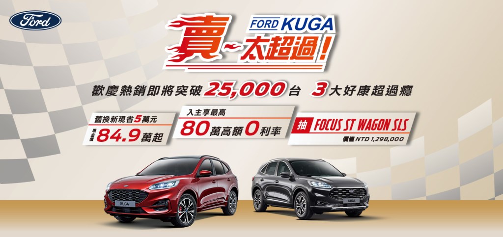 New Ford Kuga在台上市至今超過一年半,成功開創「純正運動跑旅」新格局,銷售累計即將突破25,000台的里程碑,其以EcoBoost®180/EcoBoost®250雙外觀、雙動力的雙主力車型策略,成功結合人人都能擁有的性能駕馭樂趣、完整智能科技與安全配備,更在80萬價格級距起實踐了「渦輪動力、Level 2駕駛輔助系統、大空間」的定位,驗證其堅強的產品戰力。為回饋國內消費者支持,即日起至2022年3月31日止,「Ford Kuga賣太超過!」優惠限時登場,入主New Ford Kuga不僅可享舊換新現金價84.9萬起/或享最高80萬高額0利率優惠購車方案,讓消費者輕鬆坐擁純正運動跑旅。