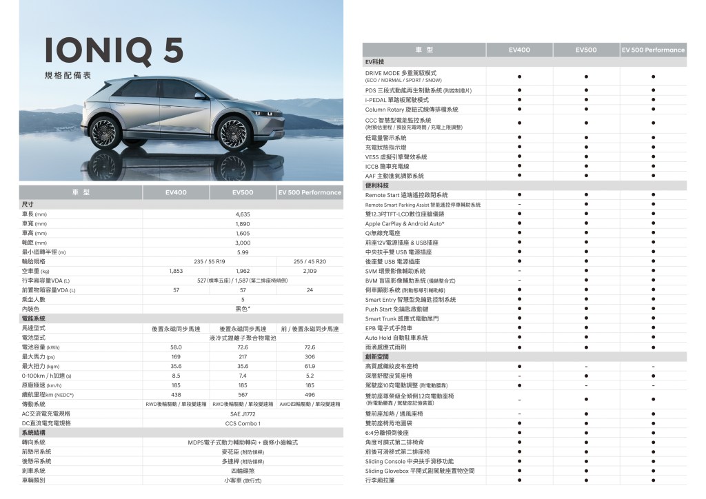 至於攸關續航力的電池容量,EV400和EV500的電池總電量分別為58.0 kWh和72.6 kWh,最大續航里程(依據NEDC測試標準)為EV400達438公里,EV500達到567公里,EV500 Performance則達到496公里,甚至超越同級動力燃油車行駛里程。超快速充電部分,IONIQ 5擁有當前最大800V直流快充系統,可支援400V/800V輸入電壓以及可相容350kW超高速充電樁,官方實測5分鐘補充超過110km續航里程,18分鐘內即可完成10%-80%充電,大幅提升擁車行駛便利性。加上配置精準掌控電池電能技術:PDS三段式動能再生制動系統(附控制撥片)、i-PEDAL 單踏板駕駛模式、Column Rotary 旋鈕式線傳排檔系統、低電量警示系統、充電狀態指示燈、CCC智慧型電能監控系統(附耗能比例/預設充電時間/充電上限可調)、VESS虛擬引擎聲效系統及V2L外接供電轉接器,徹底改變世人對電動車的未知焦慮。