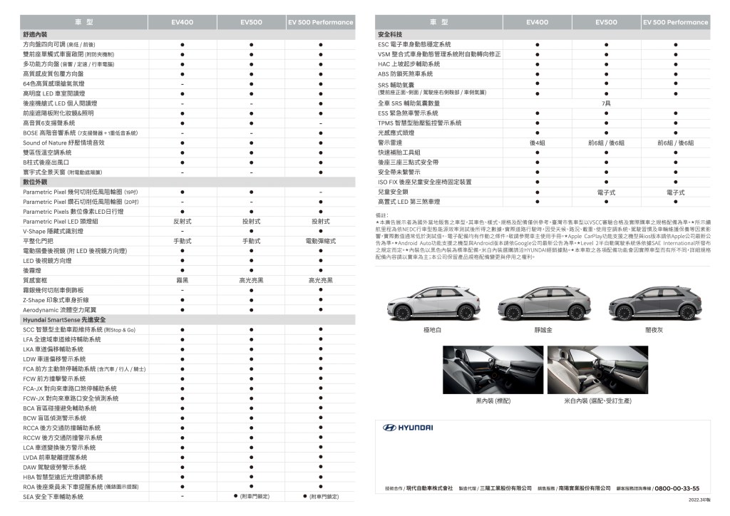 全新發表IONIQ 5將提供EV400、EV500及EV500 Performance三款車型,即日起接單價EV400 $145萬元、EV500 $169萬元、EV500 Performance $189萬元,購車充電體驗三重優惠:第一重贈送家用充電樁註1(市值$50,000元),第二重全國最大連鎖快充站2年極速充電金(市值$60,000元),以及預接期間早鳥加贈V2L外接供電轉接器(市值$30,000元)。全新IONIQ 5首開先例推出「eTry」體驗專案,可依自由選擇一日短租體驗、訂閱式季租體驗及低月租長租體驗註2,季租期滿租金更可直接折抵購車價,搶先體驗未來純電SUV。