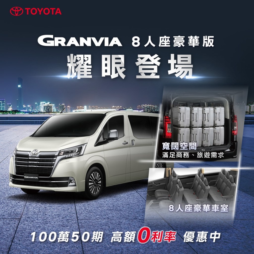 GRANVIA 8人座豪華車型加入,讓GRANVIA車型選擇更加完備,6人、8人、9人三種座椅配置,全方位滿足企業商務接送、包車旅遊、多人乘載等需求。為了讓更多顧客盡早體驗GRANVIA 8人豪華車型,新車預接單價只要169.9萬元,且為了感謝大家對GRANVIA的好評,即日起至5月底,GRANVIA全車系推出100萬50期0利率購車優惠專案,讓顧客輕鬆入主GRANVIA多功能豪華商旅座駕。購車請洽和泰汽車商用車經銷商/長源汽車、蘭揚汽車、東部汽車營業據點;亦可至TOYOTA商旅車官網 (www.toyota-granvia.com.tw) 查詢,或致電和泰汽車顧客專線0800-522567洽詢。