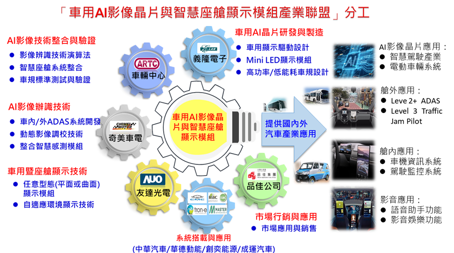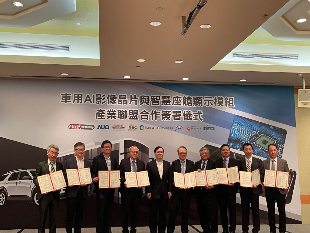 財團法人ARTC車輛研究測試中心宣布與義隆電子、友達光電、奇美車電、中華汽車、華德動能、成運汽車、創奕能源、大聯大品佳成立「車用AI影像晶片與智慧座艙顯示模組產業聯盟」共同簽署MOU,將結合上中下游產業鏈,建立國內自主車用IC顯示技術能力、開發自主設計車用AI影像暨Mini LED顯示運算晶片組、結合任意型態顯示技術,建立智慧座艙產業自主技術,研製符合國際車用影像感測晶片之ADAS應用模組與系統,並依照電動車廠(EV Bus、EV Car)智慧座艙需求,結合艙內外感測AI技術,打造車輛智慧化的關鍵技術,提升產業價值,建造車電護國群山。