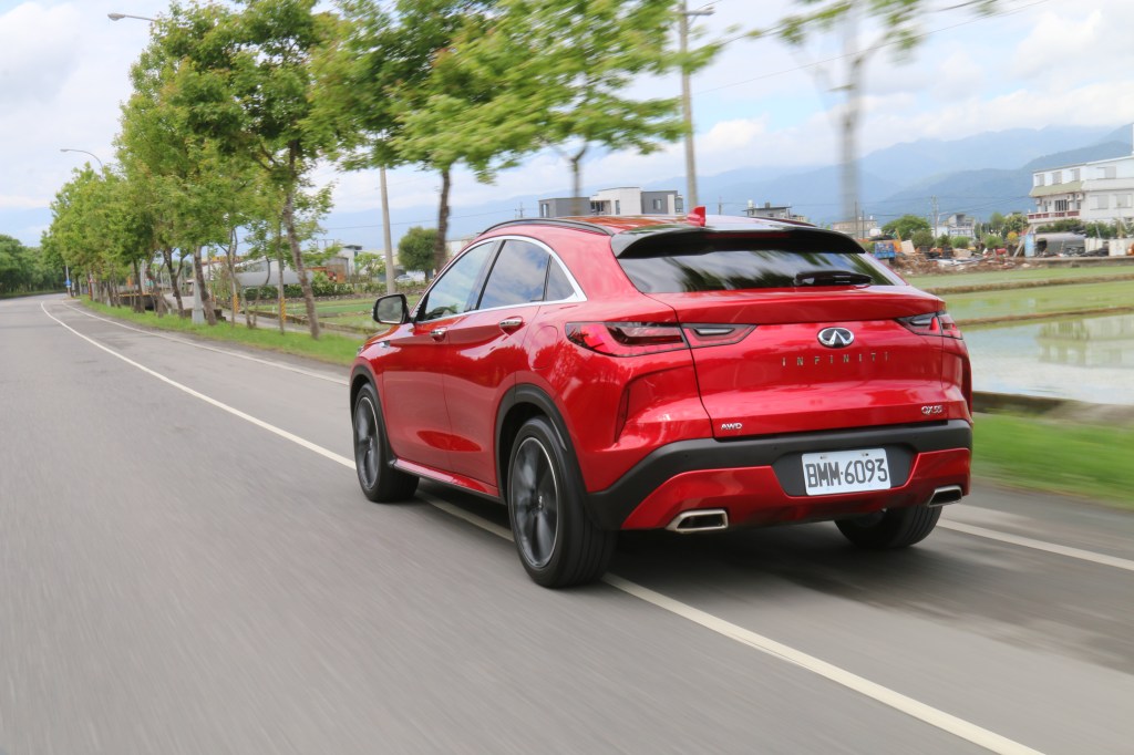 而動力,那具1,997c.c. VC渦輪增壓直列四缸引擎確實能省下不少稅金,輸出功率268hp/5,600rpm、38.7kgm/4,400rpm就數據上也算亮眼,實際上很是充裕,雖然具備可變壓縮比但說實在很難感受到其變化,似乎只能從油耗表現才能下定論。不過,為了經濟性而生的XTRONIC變速箱縱使有八速手排模式,但仍舊是最不得我緣的CVT,從反應設定看得出原廠努力營造傳統自排的氛圍,並擺脫加速起步有點「拖」的宿命,然而物理不變法則就是宿命,在D檔模式下的再加速「拖」得有點明顯,若改以M模式利用換檔撥片升降檔,就可消弭這現象。畢竟QX55是開帥不開快,沒辦法,和同級競品擺在一起肯定會很跳,也會很吸睛,而這並不是完全沒有操控性,反之路感回饋清晰、處理坑洞崎嶇路面上乘、轉向頗為精準都是特色。