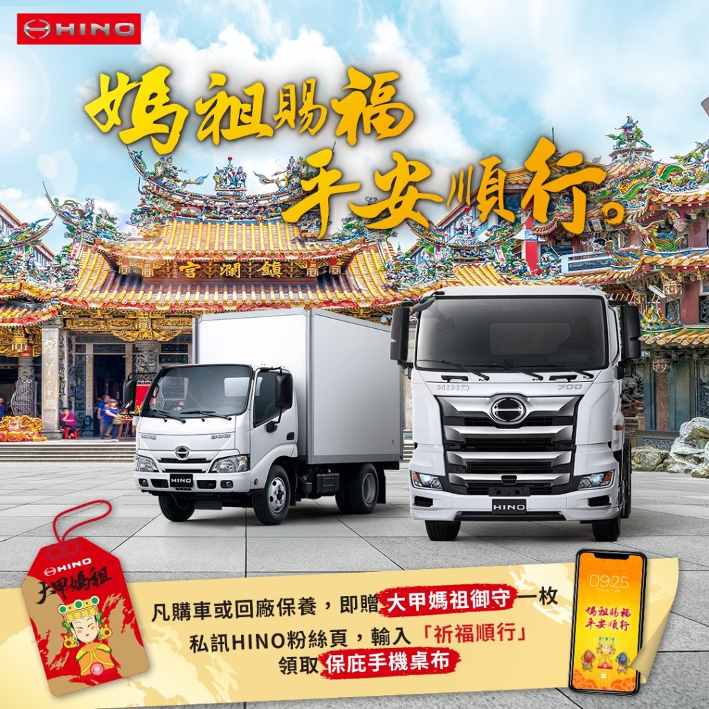 一年一度大甲鎮瀾宮媽祖遶境盛事即將到來,今年度HINO品牌再度與大甲媽祖遶境活動結合舉辦全台「HINO平安月」活動,將品牌在地深耕、關懷台灣文化精神傳遞出去,此外,今年剛好是HINO品牌在台灣第70年,長久以來HINO持續陪伴全台車主,秉持對車主服務陪伴的心一同與車主們祈求媽祖保佑平安順行。