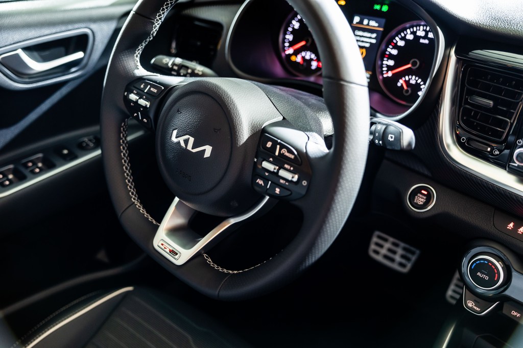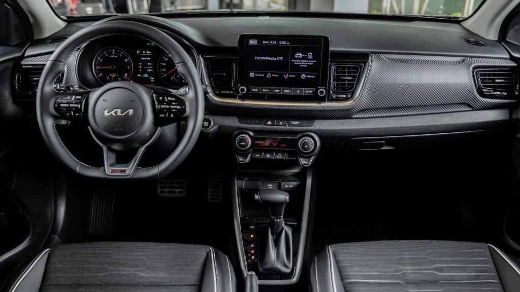 1.0T 智慧油電 GT-line車頭以Kia專屬虎鼻式造型水箱護罩,搭配下方撞色的三氣孔GT-line專屬運動化外觀造型設計,整體更加動感時尚,加上四點式LED日行燈與Tiger Eyeline造型頭燈組,搭配類金屬幾何造型外飾LED霧燈,開創新潮設計風格外觀。此外,1.0T 智慧油電 GT-line不僅擁有專屬雙色搭配,共有芎蒼灰車身搭配雲雀黃車頂色、芎蒼灰車身色搭配艷麗紅車頂色兩款,融合流線掀背身型,搭配GT-line專屬的鋼琴烤漆外後視鏡、17吋雙色切削輪圈,與車尾跑格化雙邊尾飾管,以大膽耀眼的設計風格展現奔放精神,打造出自我風格。車室的設計則是透過細節展現特色,內裝以運動化D-Cut 方向盤,搭配類金屬及類碳纖維飾板與Tiger Nose 紋路複合材質座椅,由內而外彰顯動感的活力視覺。
