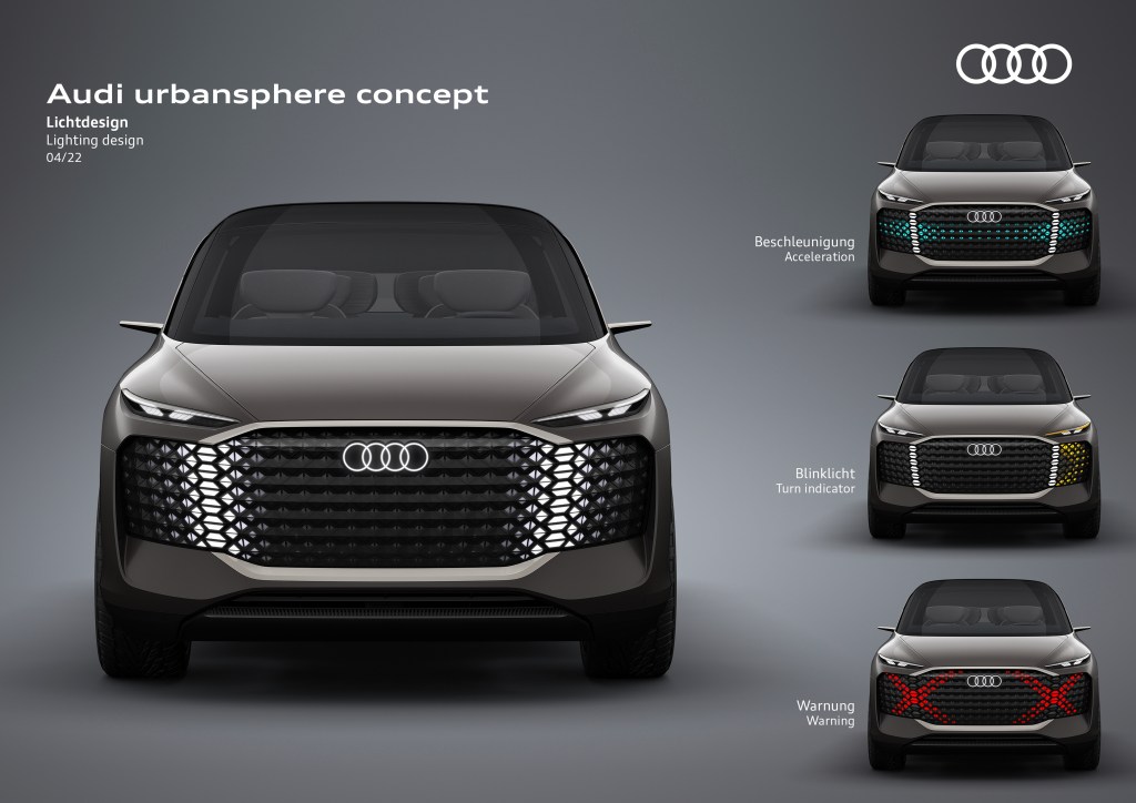 Audi urbansphere concept 採用長軸距、短前懸的四環電動車經典設計語彙,而團隊在車頭外觀設計部分亦作創新突破,採八角型的造型,雖Singleframe 已非擔任過往進氣閘口的功能,於urbansphere 上藉由創新數位化科技,Singleframe 演化為「Audi Light Canvas 燈光畫布」可對外進行溝通,透過動態燈光效果向其他道路使用者發出如Warning警示、Acceleration加速中及Turn indicator轉向指示等溝通信號;而車頭上方左右兩側照明設計呼應四環Logo圓圈交疊的部分,如眼睛瞳孔的「Audi Eyes」,可自動偵測適應交通狀況、環境、甚至乘客的情緒,於日間行車燈啟動時,像虹膜般調整燈光的聚焦程度,展演更進化的燈光科技。
